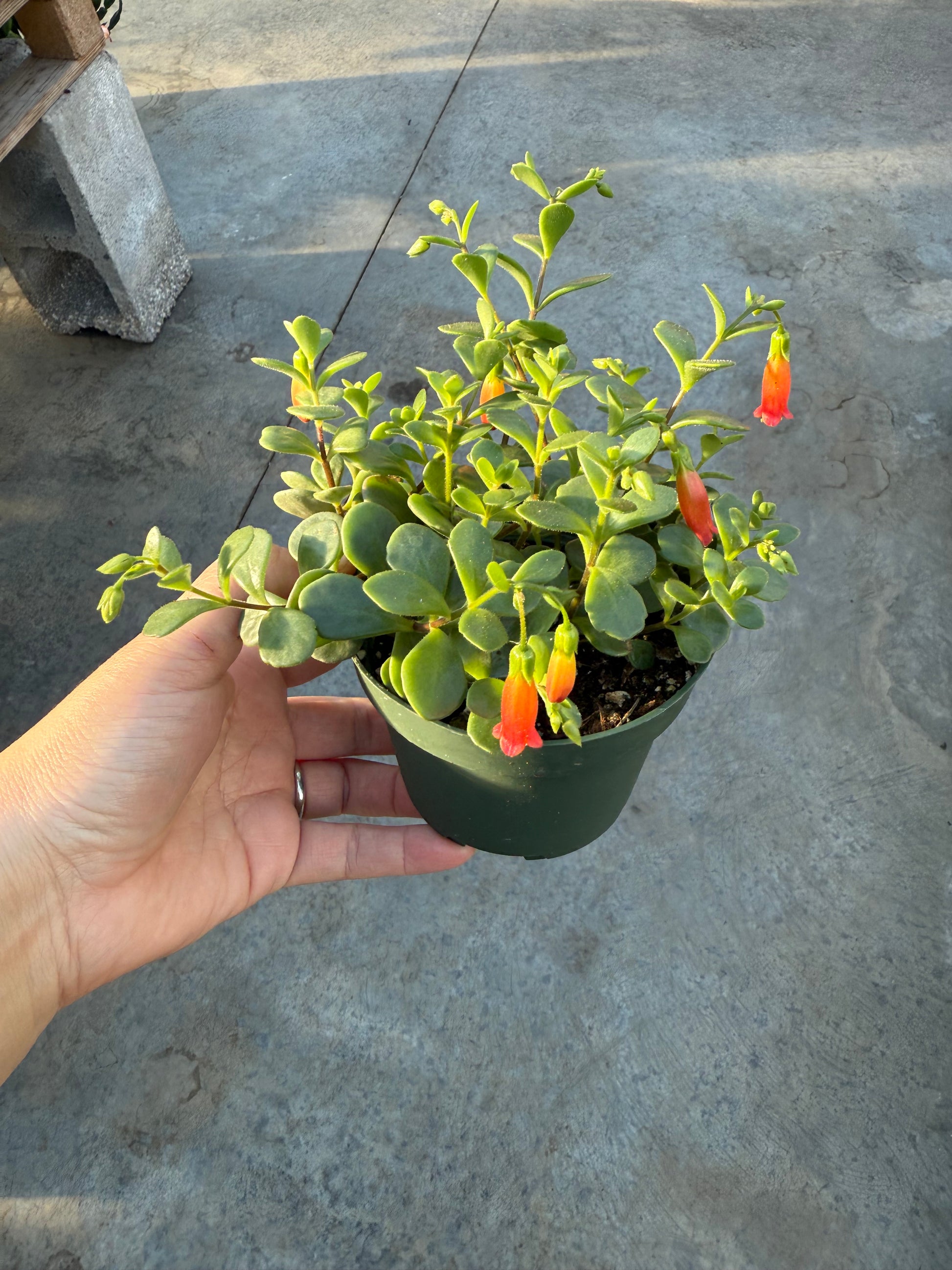 Kalanchoe manginii is a graceful trailing succulent best known for its bell-shaped flowers that dangle delicately from arching stems. Often called Chandelier Plant, it produces vibrant coral to orange-red blooms that create a striking cascading display. Its soft, rounded foliage and flowing growth make it ideal for hanging planters or elevated shelves.